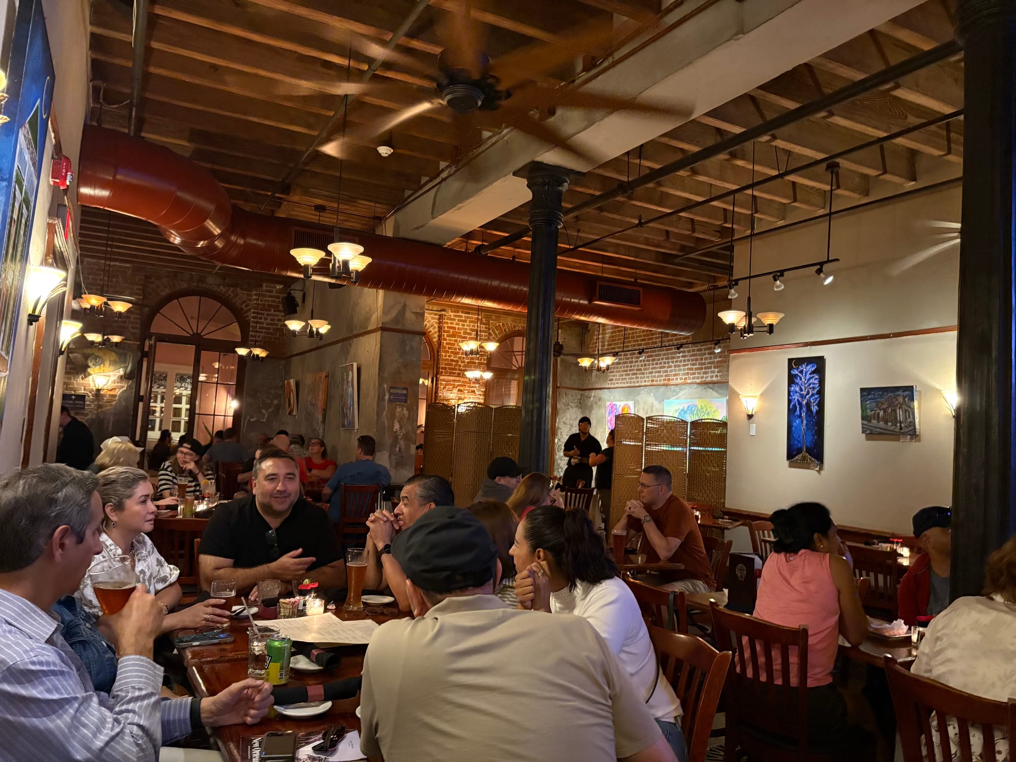 With the sun shining and the weather warm, we took a leisurely meandering route back to our hotel, cruising through the waterfront walk. A lovely riverside breeze greeted us near the ferry, cooling us down as we continued along. Off in the distance, the twin steamboats sat, having finished their latest tour of the Mississippi. We spent a little time making our way through art installatations, memorials and statues, before turning off the waterfront and arriving at our final stop for the night: Crescent City Brewhouse.